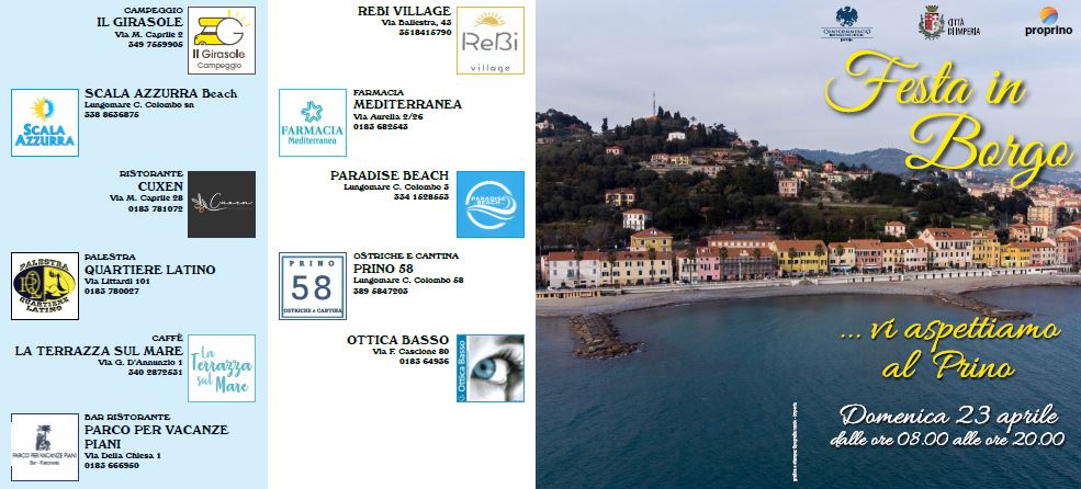 Domenica 23 aprile dalle 8 alle 20 torna la Festa in Borgo Prino, organizzata dall’Associazione Proprino e dalla Confcommercio della Città di Imperia, con la compartecipazione del Comune di Imperia.