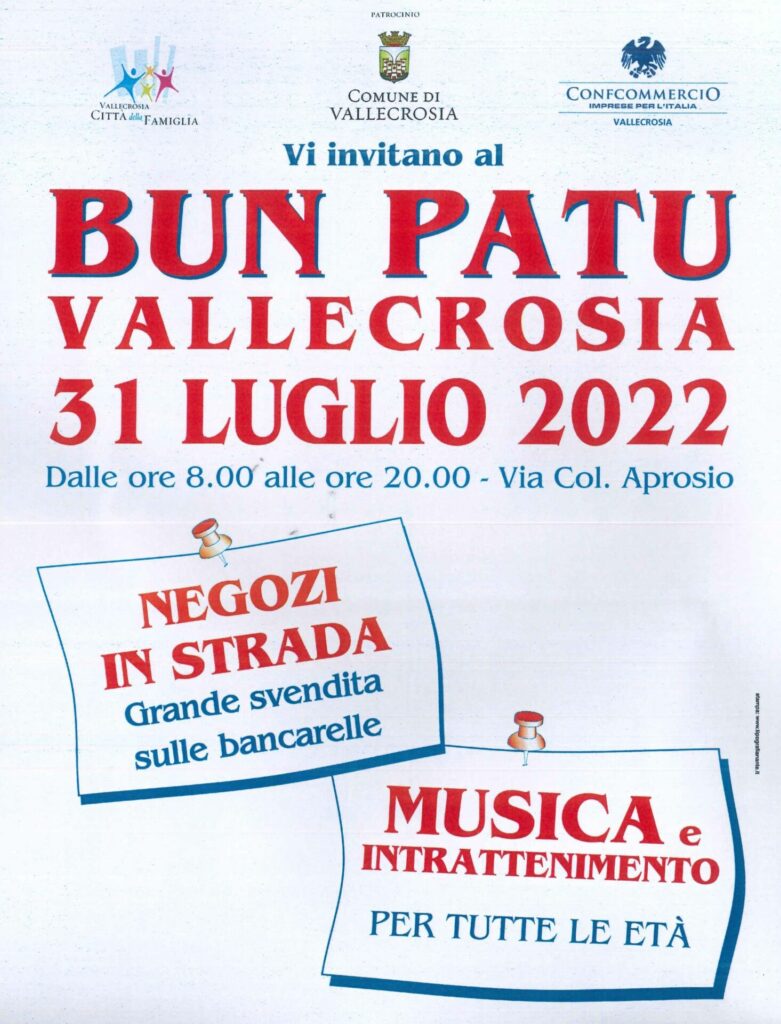 Dalle 8 alle 20 domenica 31 luglio, torna a Vallecrosia “Bun Patu”, la grande iniziativa organizzata dalla Confcommercio in collaborazione con il Comune. I negozi proporranno una grande svendita in strada, con le loro bancarelle, lungo via Colonnello Aprosio.