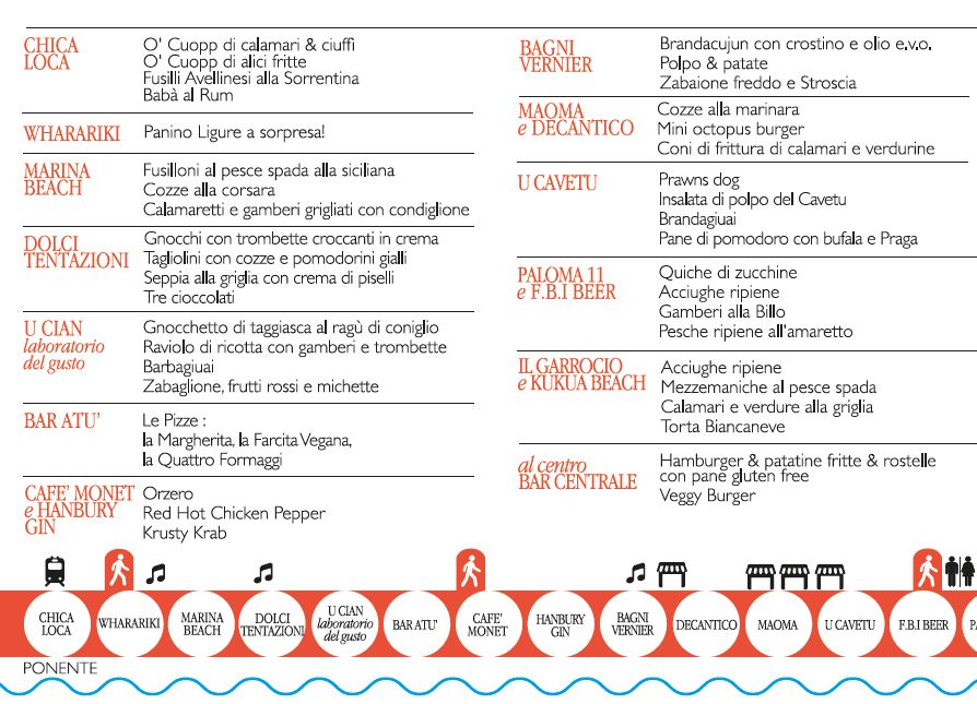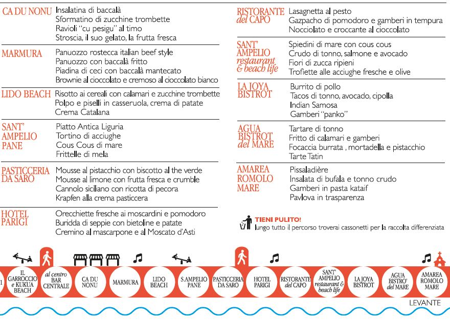 Si tratta di una formula semplicissima. I ristoratori coinvolti nell’iniziativa, proporranno alcuni piatti della cucina ligure e non solo, che potranno essere degustati seduti ad uno dei tanti tavoli allestiti nel Lungomare e a prezzi promozionali, il costo previsto per ogni singola portata è compreso tra i 4 e 10 euro. Un’occasione non solo per i residenti ma anche per i turisti che potranno degustare ricette di gastronomia tipica in un contesto speciale.