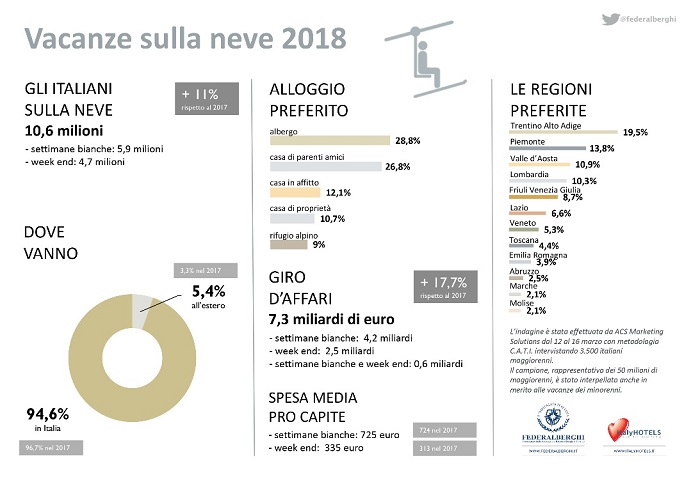Sono 10,6 milioni gli italiani che hanno trascorso o trascorreranno una vacanza sulla neve tra gennaio e marzo 2018, con un incremento di circa l’11%. Di questi, circa 5,9 milioni hanno effettuato o effettueranno la classica settimana bianca (+17,4% rispetto al 2017), mentre 4,7 milioni hanno scelto di concentrare le proprie vacanze nei week end (+3,9%). Il giro di affari complessivo sarà pari a 7,3 miliardi di euro, in crescita del 17,7% circa rispetto ai 6,2 miliardi dello scorso anno. Di questi, 4,2 miliardi sono relativi alle settimane bianche, 2,5 miliardi sono stati spesi durante i week end e 0,6 miliardi corrispondono all’ammontare speso da chi, oltre alla settimana bianca, si è concesso anche un weekend sulla neve. Sono i principali risultati dell’indagine relativa alle settimane bianche ed ai week end sulla neve, realizzata da Federalberghi con il supporto dell’istituto ACS Marketing Solutions.
